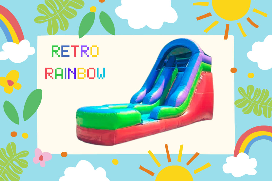 All Retro Rainbow slides were designed with children’s safety in mind. The soft inflated landing zone cushions landings and the integrated drains prevent deep water pooling. The slide supports supervised play for kids and adventurous adults alike, and routine inspections keep seams and anchors secure.